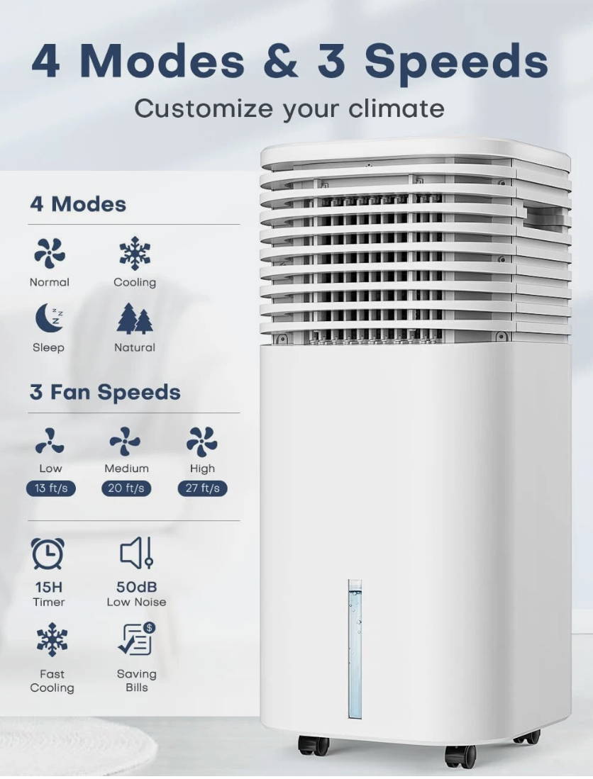 Beat the dry summer heat with the 4-in-1 Evaporative Air Cooler—the ultimate cooling solution for hot, arid climates.