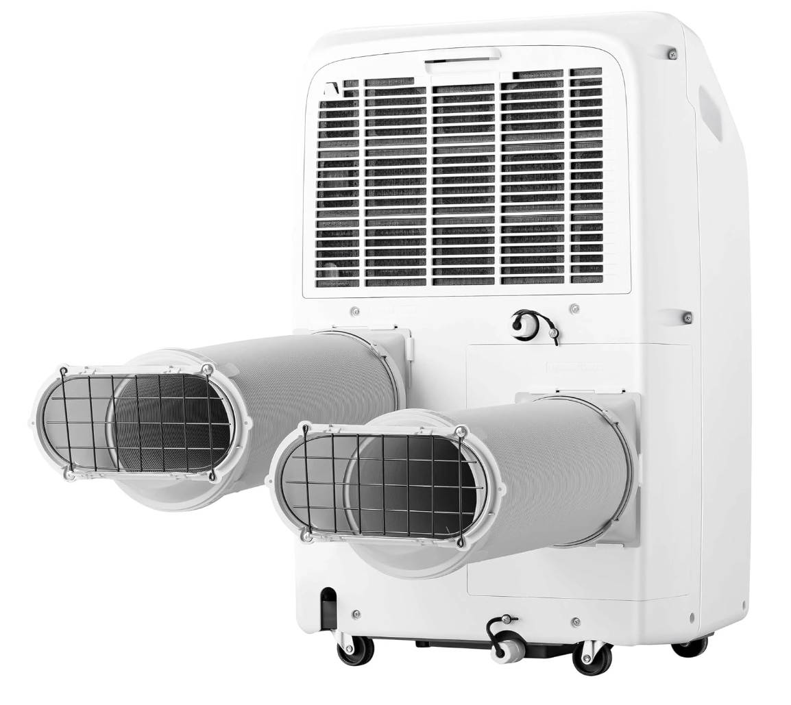 The innovative dual hose design cools rooms more efficiently by balancing air pressure.
